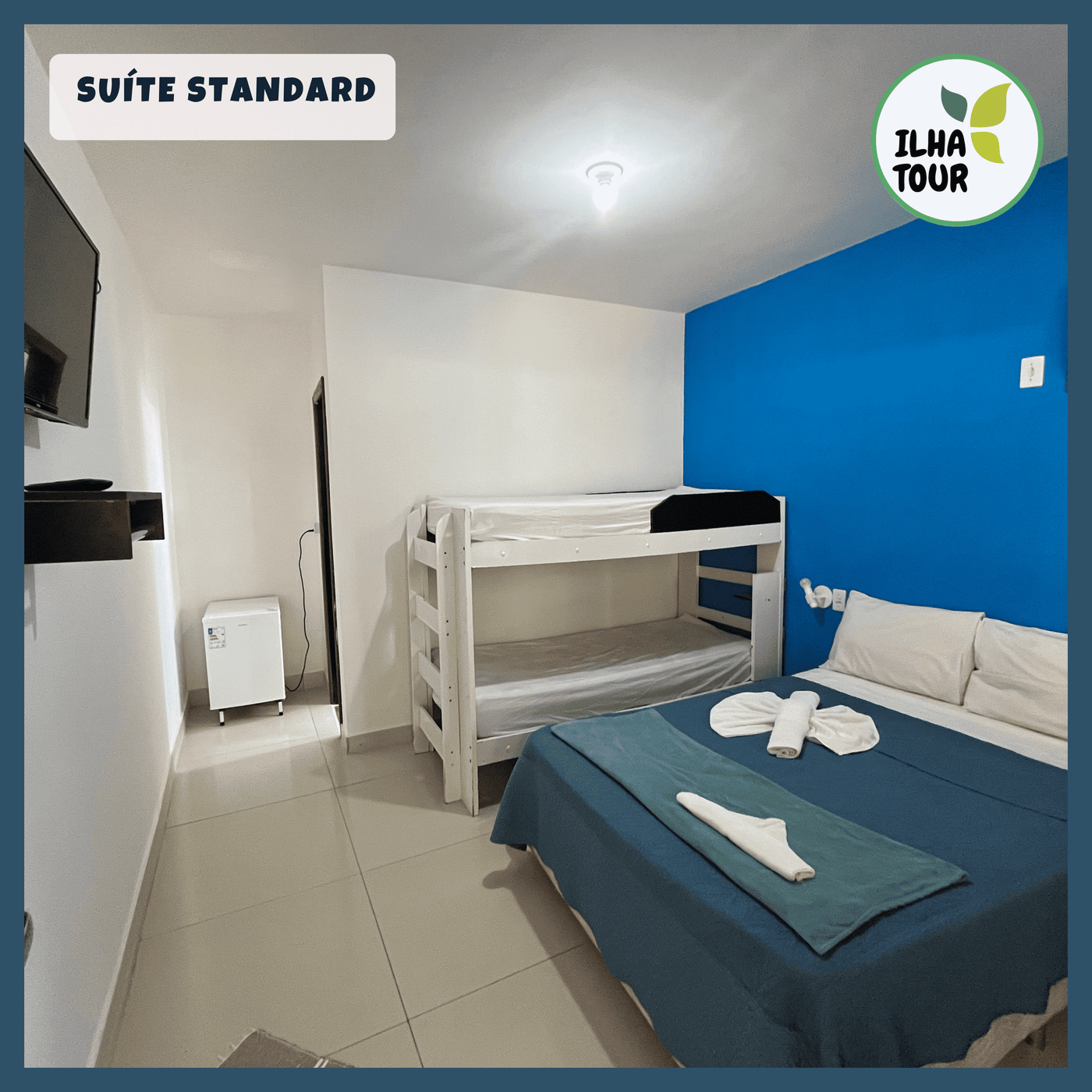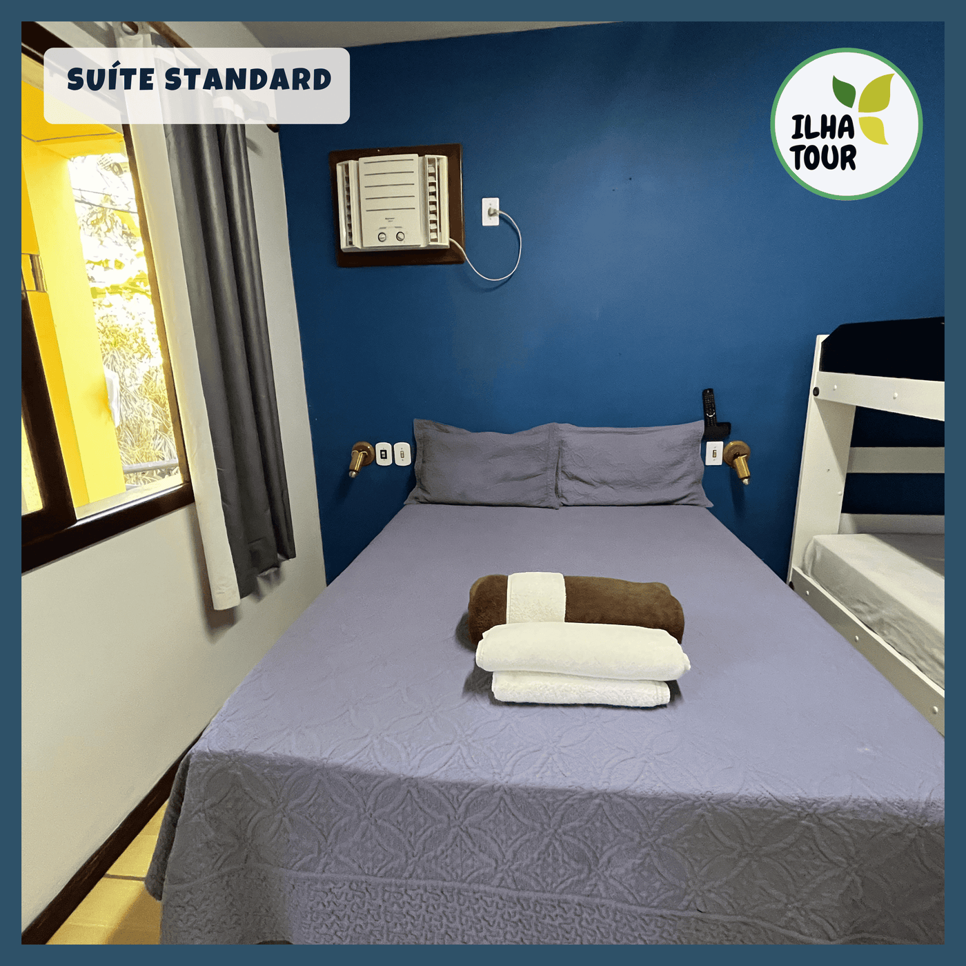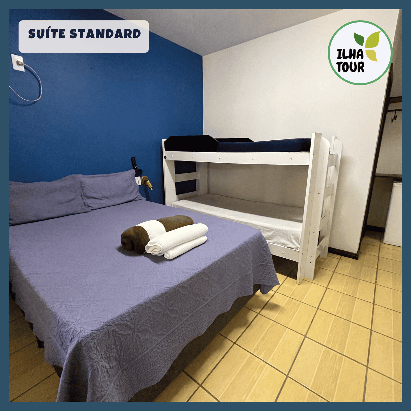 Nas Suítes Standard da Ilha Tour, você encontrará tudo o que precisa para uma estadia confortável: Ar-condicionado, Wi-Fi, Roupa de cama, Ventilador e Banheiro privativo. Nossas suítes são padronizadas, acomodando até 4 pessoas, ideais para casais, famílias ou grupos!